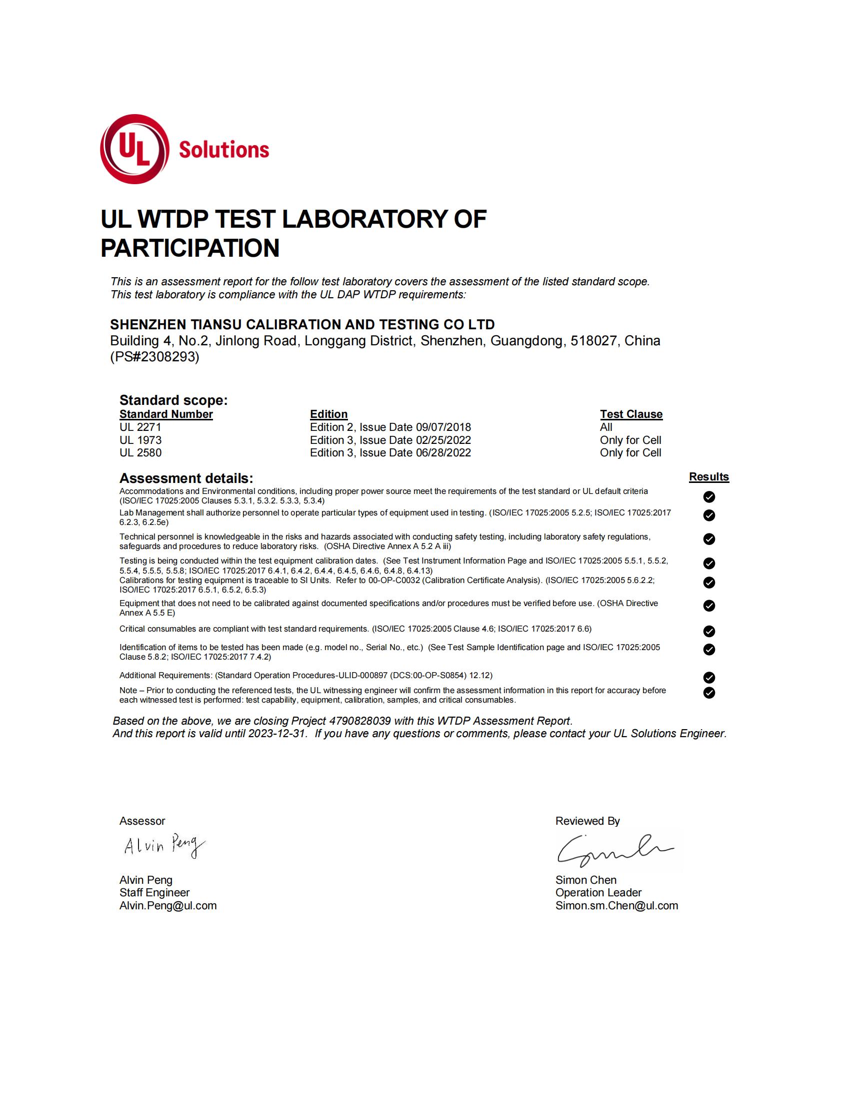 電池檢測專注于電池產品的全球認證檢測,建立了設備齊全的電池測試實驗室,包括:電池充放電測試實驗室、電芯充放電測試實驗室、移動電源充放電測試實驗室、可程式恒溫恒濕測試實驗室、電池短路測試實驗室、電磁式振動測試實驗室等。